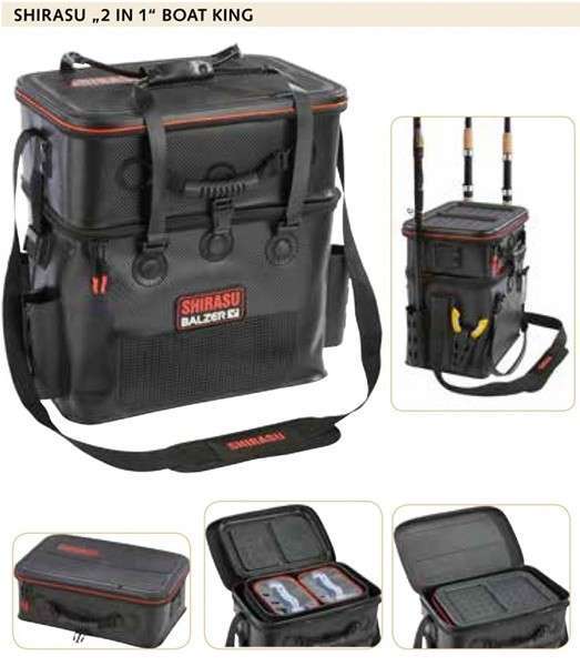Balzer'den Shirasu Boat King 2'si 1 arada, özellikle teknede kullanılmak üzere tasarlanmış harika bir yırtıcı balıkçılık çantasıdır. Çanta büyük bir alt bölüm ve daha küçük bir üst bölümden oluşur. Her iki parça da ayrı ayrı veya birlikte kullanılabilir. Alt kısım geniş bir ana bölmeye sahiptir ve üst kısım daha küçük aksesuarlar için mükemmeldir ve sert bir üst kısmı vardır. Çanta üzerinde üç kamış tutucu ve bir tang tutucu vardır. kıyı balıkçıları için gerçek bir yüksek kaliteli süper çanta